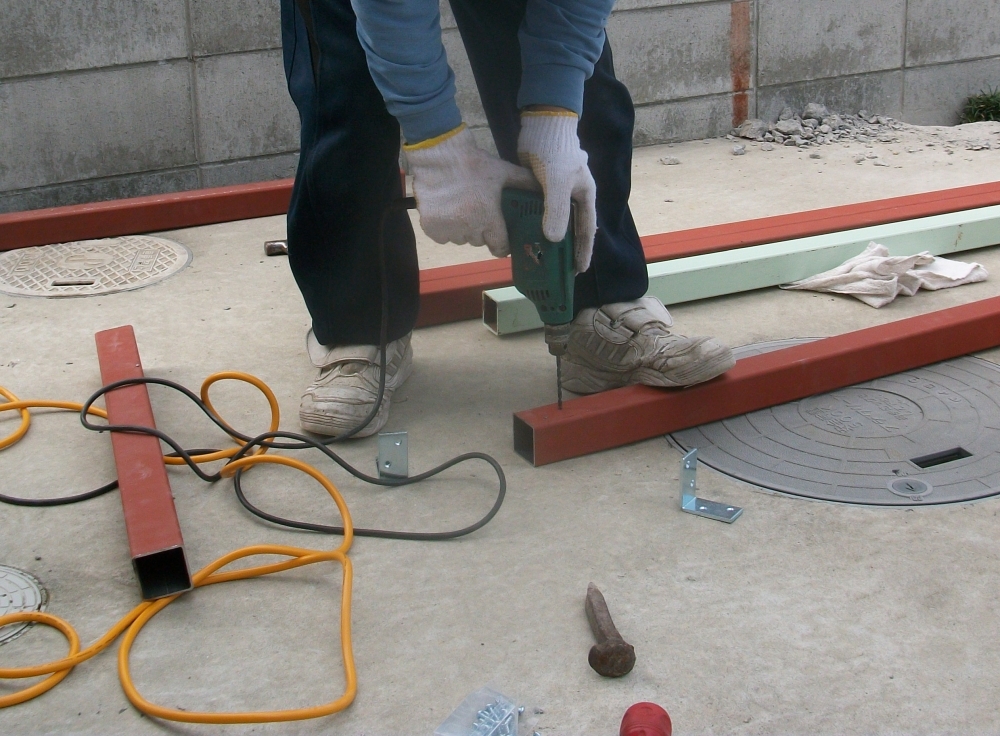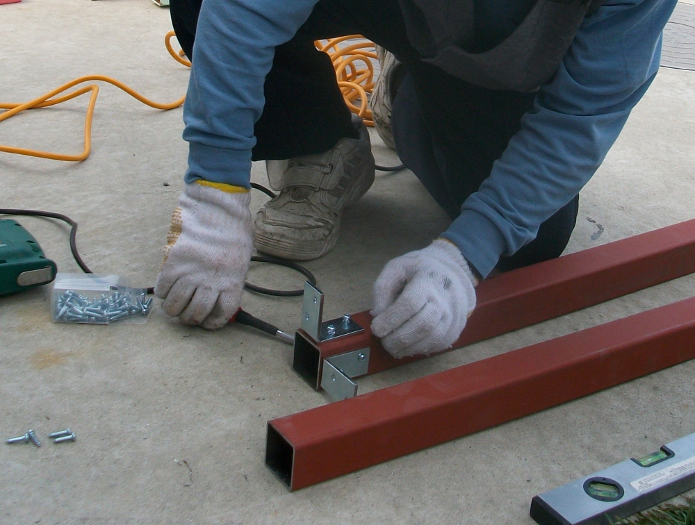 支柱どうしをつなぎ棒(鉄骨)で下記の (ジョイント用)鉄板、L金具でビス止めして固定する