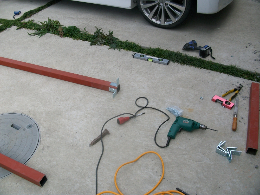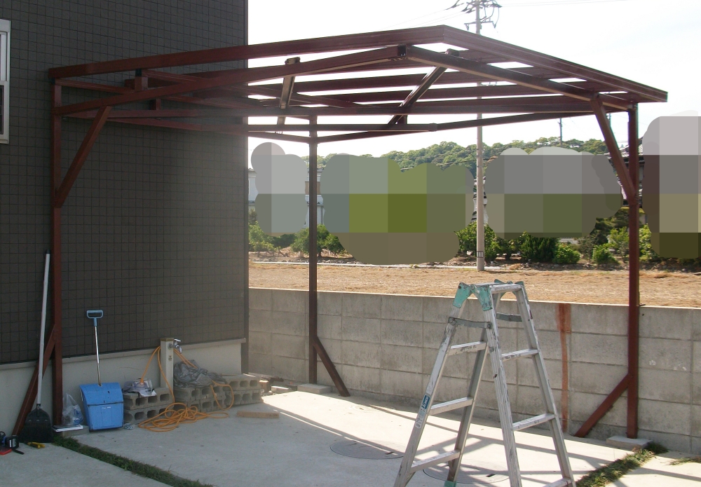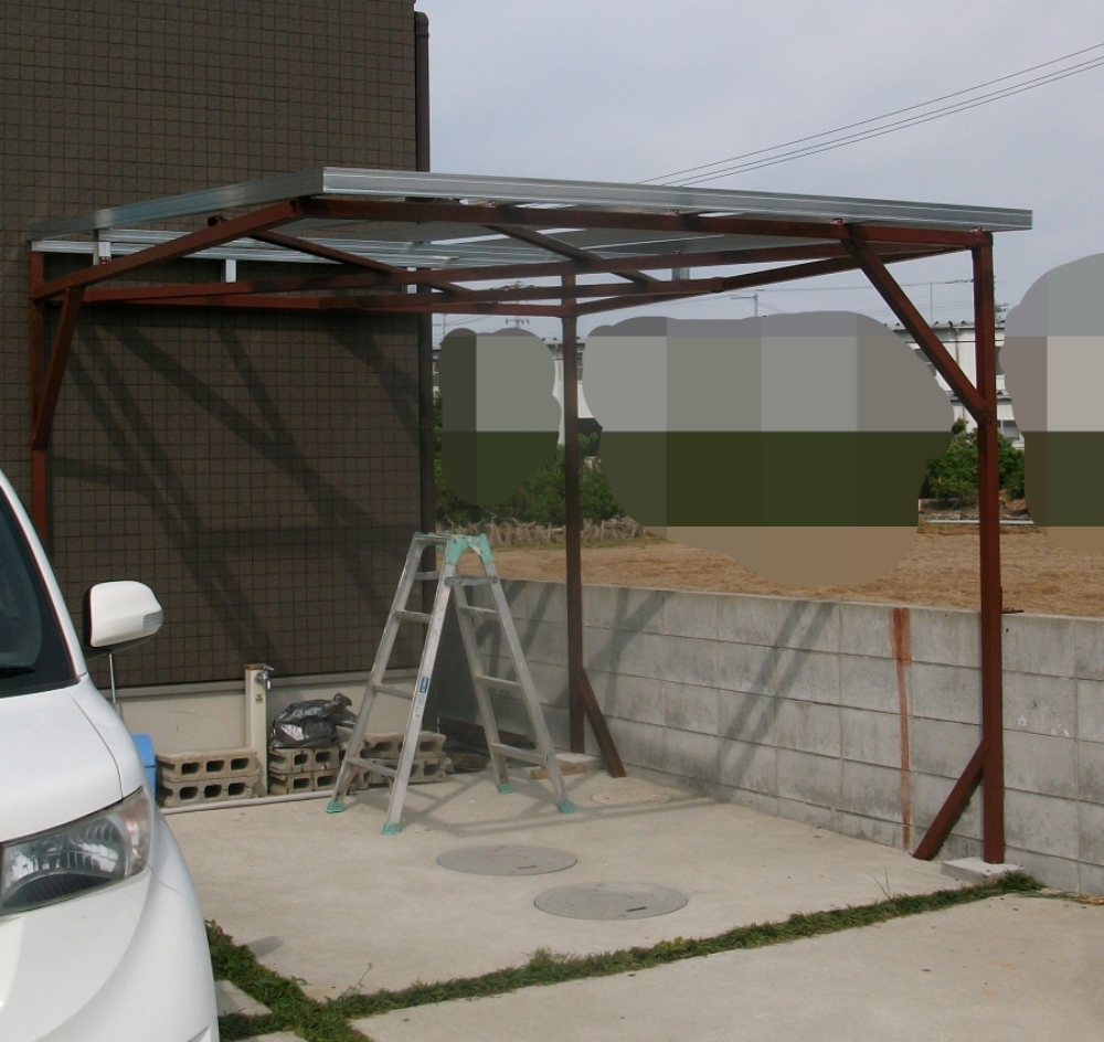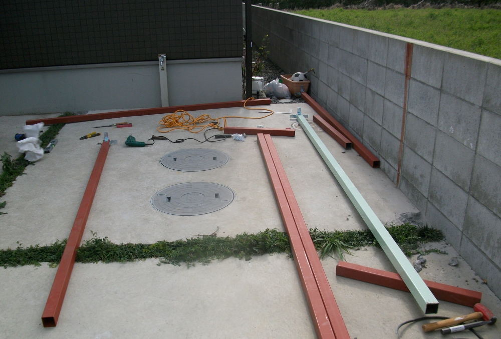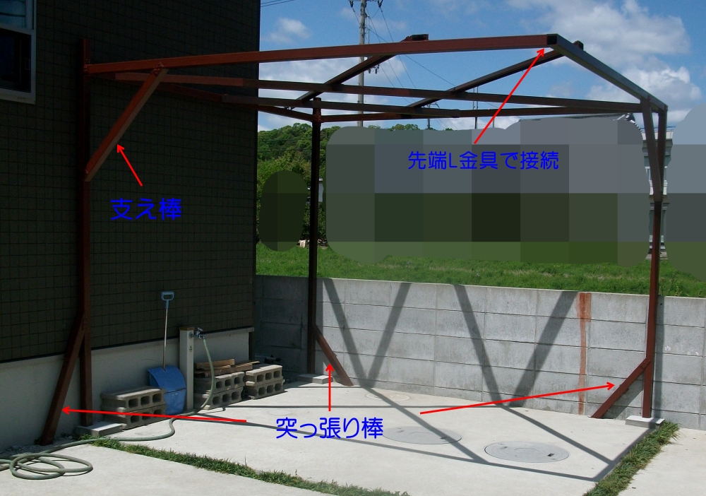 3本の柱は、5cm×5cmの鉄骨を使い、高さは 軽のハコバンが駐車できる高さにしました!