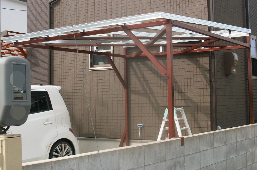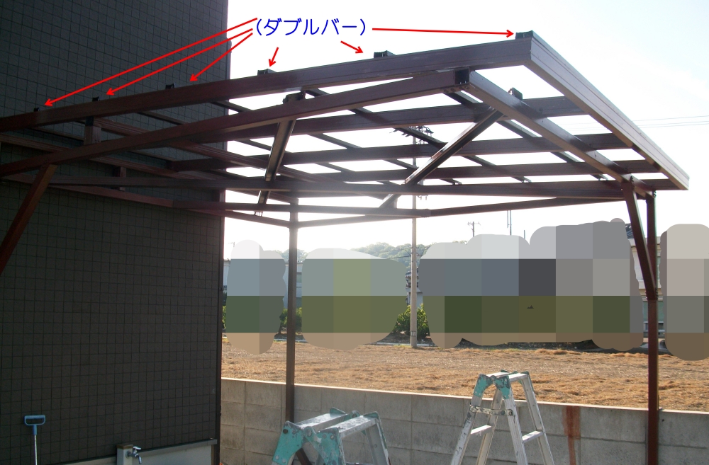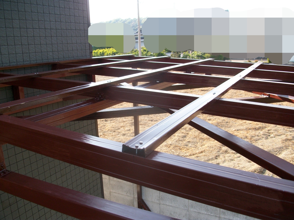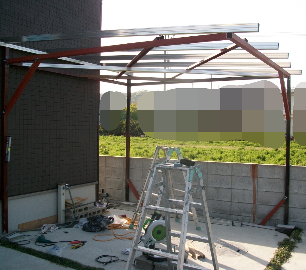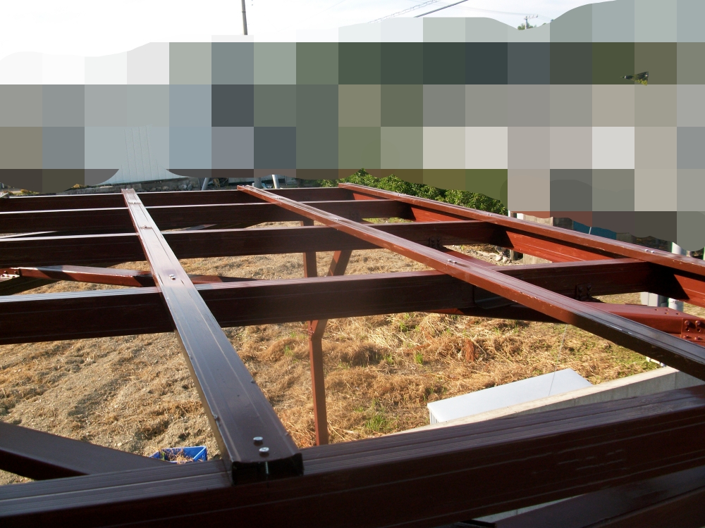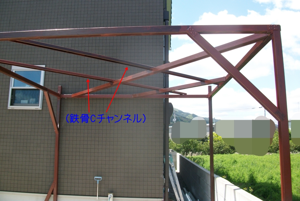 同じ様に、天井部分にもう1本の鉄骨を家側の支柱に支え棒(鉄骨)で固定して、垂木支え鉄骨と