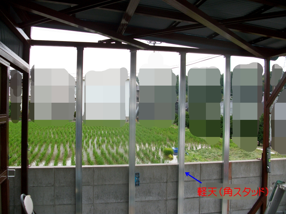 まずは、軽天の角スタッドで柱を立てることにしました。