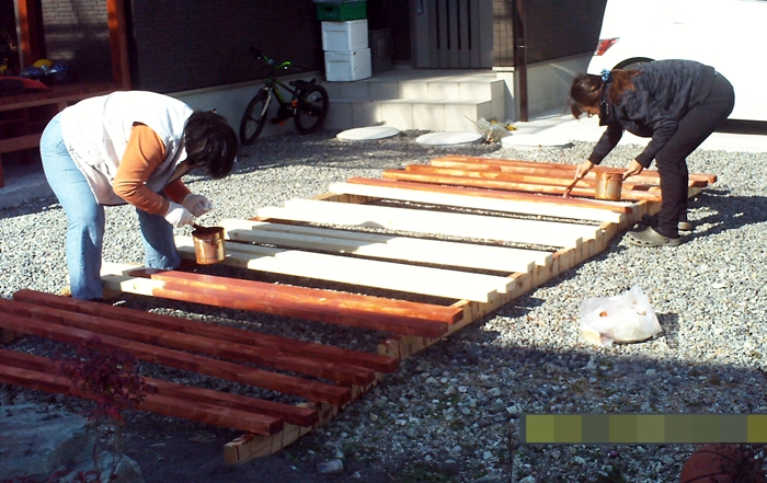 デッキの横の長さの4等分の長さに仕切り、下図の様に木材を組み立てた後