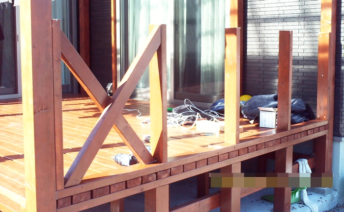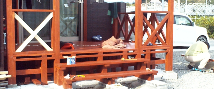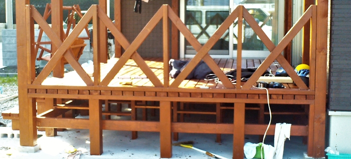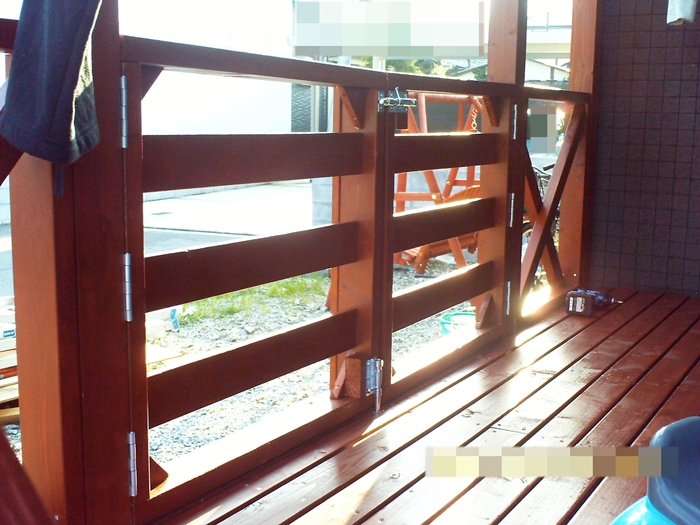 ○ デッキに取り付けた後、X状に突っ張り板を取り付ける。